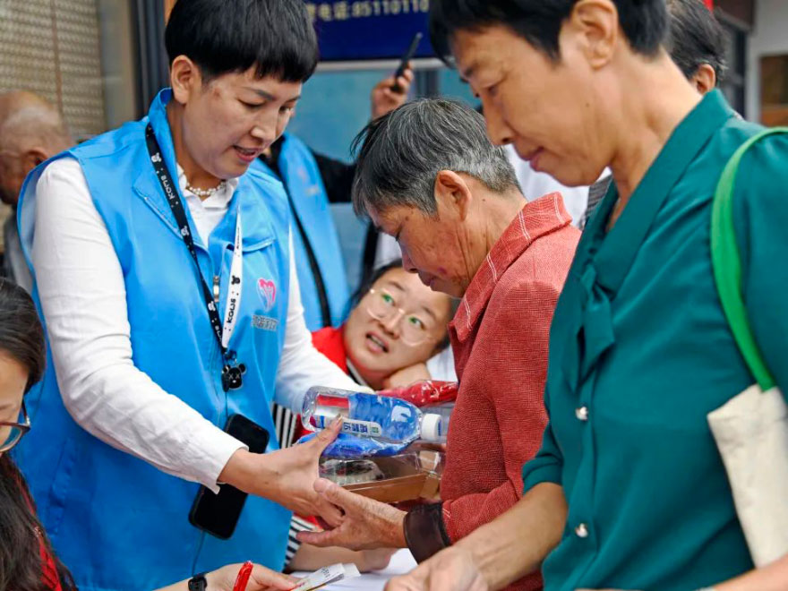 活动尚未正式开始,爱心理发的摊位前已经有老人翘首以盼,争前恐后进行登记,希望理发师能赶紧让自己“精神抖擞”。同时,活动现场,市家协、钟楼区青商会及协会爱心企业还准备了近千份爱心礼包,礼包包含重阳糕、毛巾、洗手液等慰问用品,共同为老人们送上节日的祝福。